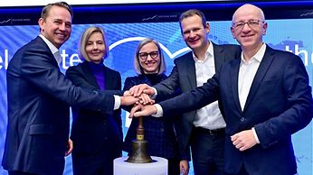 Dr. Christoph Böhm, Mitglied des Vorstands Deutsche Börse AG und CIO/COO; Michael Girg, Chief Cloud Officer Deutsche Börse Group; Agnes Heftberger, Microsoft Germany CEO; Marianne Janik, Google Vice President for EMEA North; Sven Mulder, Managing Director SAP Germany (v.r.n.l.)