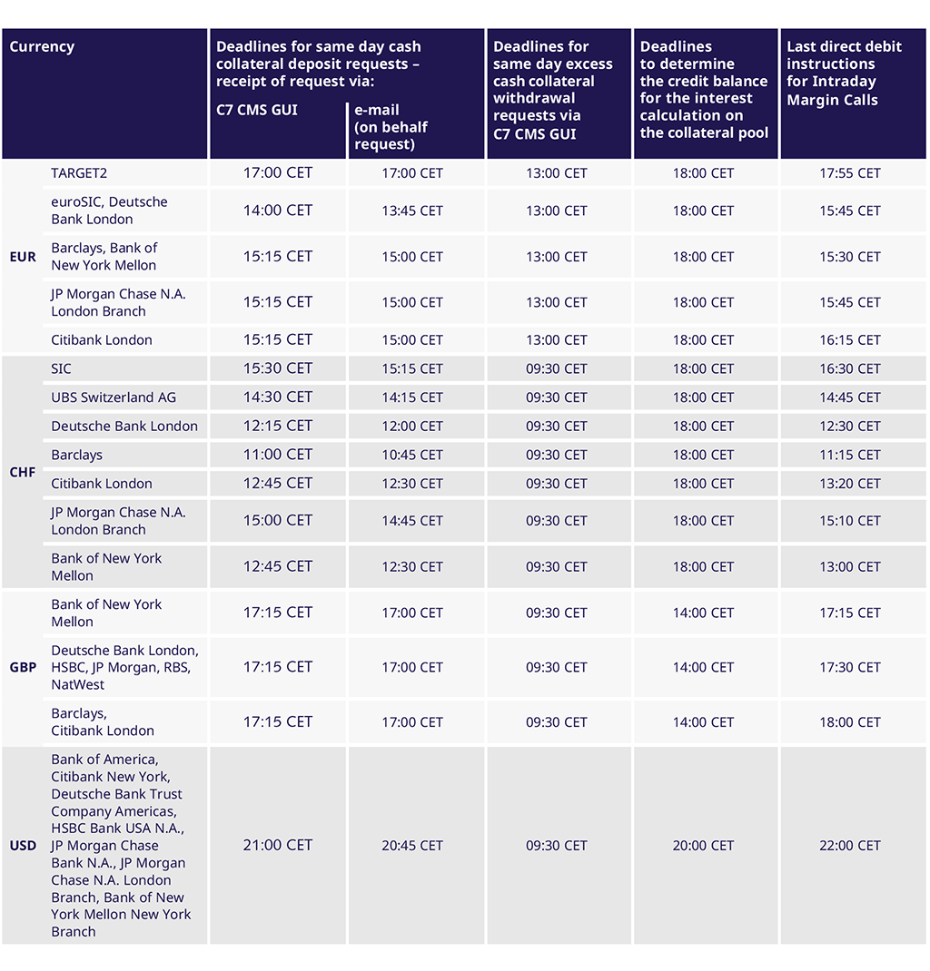 In case JPY is utilized as cash collateral currency a pre-advice for deposits and withdrawals is required by 14:00 CET on T-2.