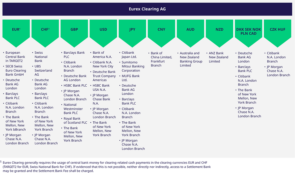 For all obligations that arise from the clearing process, such as fees, margin requirements, cash settlements and other cash obligations, Eurex Clearing manages the internal cash accounts in multiple currencies.