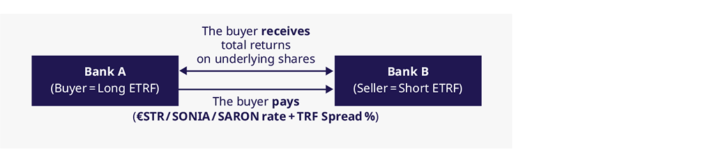 ETRFs are fully fungible contracts aiming to replicate the performance of an OTC equity total return swap (TRS). ETRFs represent the theoretical borrowing of cash to purchase the underlying equity at trade date, assuming it’s held till expiry, i.e., there is immediate exposure to the cash leg of the underlying equity. The holder of a long position will therefore receive the returns associated with holding the cash equity – against which they will pay the financing associated with this purchase. The cost of financing is comprised of the overnight funding rate and the determined traded "spread". This traded spread represents the additional rate, over the overnight benchmark funding rate, required by the seller to provide the returns of the cash equity until expiry.