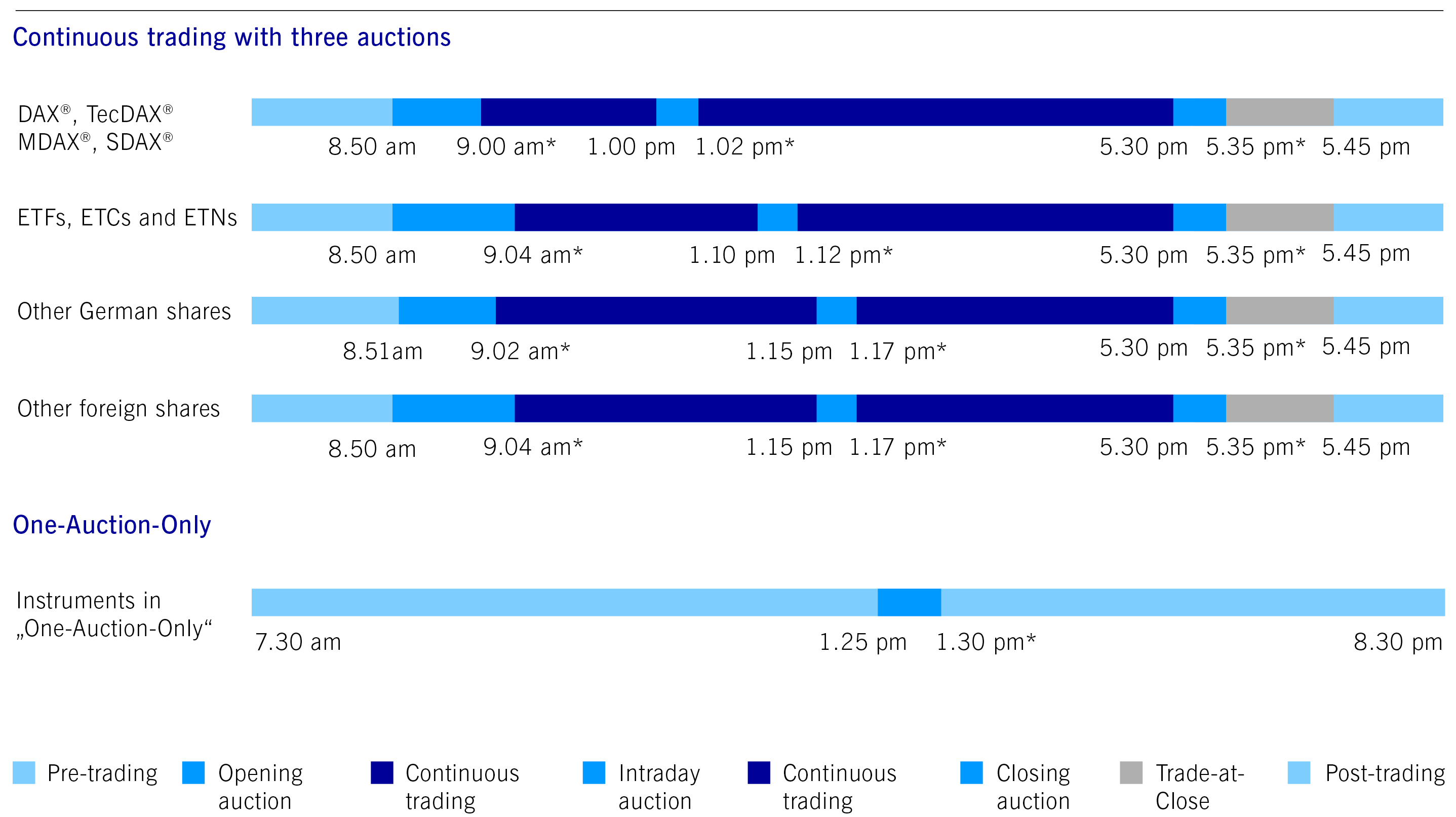 All times are an approximation. Timestamps are meant as the earliest timestamp for the explicit trading phase change. Relevant are the trading phase changes in the trading system for Xetra.
