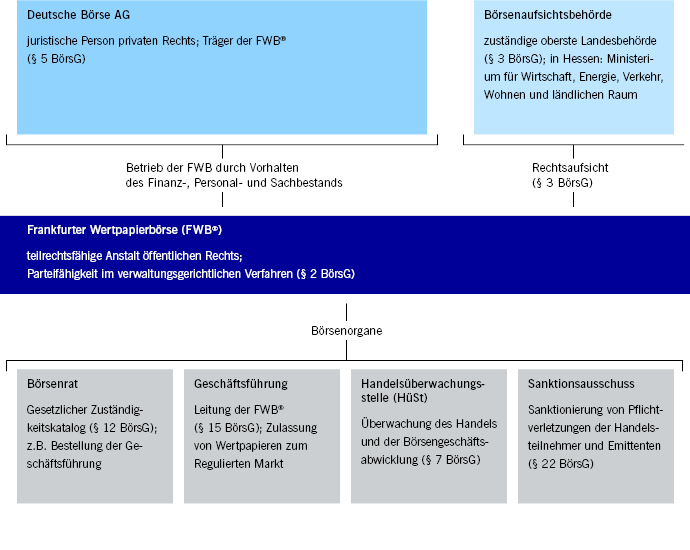 Die Trägergesellschaft der Frankfurter Wertpapierbörse (FWB®) ist die Deutsche Börse AG. Die Trägerschaft und Betriebspflicht der Deutsche Börse AG umfasst den Handel in den Wertpapieren Aktien, Anleihen, Fonds, Exchange Traded Funds (ETFs), Exchange Traded Products (ETPs) und strukturierten Produkten wie Zertifikate und Optionsscheine.