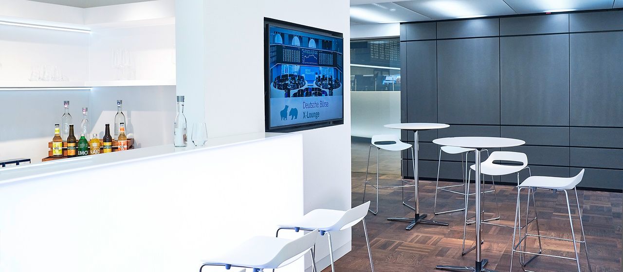 Die Deutsche Börse X-Lounge steht im Rahmen Ihres Bell Ringings oder IPOs zur Verfügung. Überraschen Sie Ihre Gäste mit einer einzigartigen Kulisse mit Blick auf das Börsenparkett. Für bis zu 80 Gäste ausgelegt, überzeugt die X-Lounge durch einzigartiges Ambiente und ein exklusives Catering im historischen Börsengebäude.