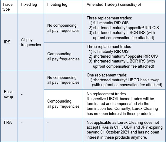 Notable exception of the conversion mechanism is the treatment of LIBOR basis swaps having compounding specified on at least one leg. Such swaps will be terminated on the conversion weekend with a termination fee equal to the net present value of the trade and no replacement trade. Currently, Eurex Clearing has no such compounded LIBOR basis swaps outstanding.