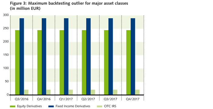The backtesting analysis includes another aspect: the assessment of the size and therefore materiality of individual outliers. The largest observed outlier (see 6_5_4) for the initial margin model was observed before 2016 and therefore remained constant in the 2016 and 2017 reporting. All individual outliers and combined two largest outliers (see 4_4_7) would have been fully covered by Eurex Clearing’s own contribution to the lines of defence and the default fund.