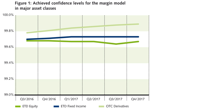 The calculation of the aggregated achieved confidence level is explained below. Figure 1 shows the achieved confidence levels of the margin model (see 6_5_3) on an aggregated basis for all major asset classes. All are well above the target levels of confidence of 99% for listed equity and fixed income derivatives and 99.5% for OTC interest rate swaps respectively.