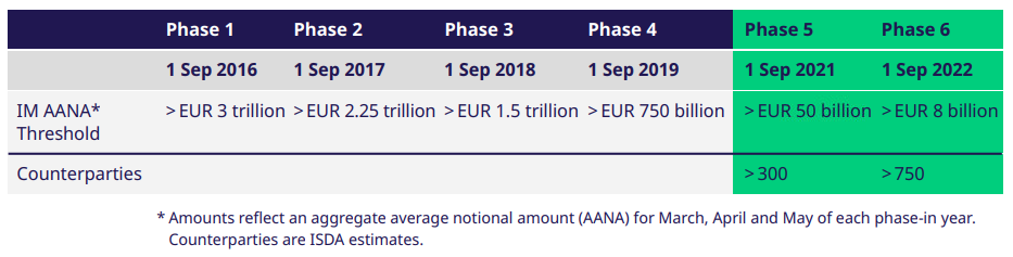 Since their introduction in 2016, the UMR had so far only impacted a limited number of large firms. But, as of September 2021 and September 2022 respectively, new phases will be introduced which require firms with an Average Aggregate Notional Amount (AANA) greater than EUR 50 billion (September 2021) and later EUR 8 billion (September 2022) to post initial margins bilaterally with each of their counterparts. It is estimated that more than 1,000 firms will be affected, including asset managers, insurance companies, pension funds, and alternative investment funds (e.g. hedge funds).