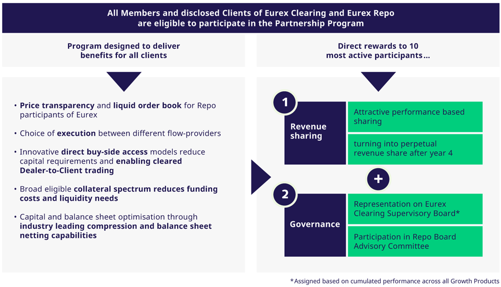 The ten most active program participants will be eligible for a significant share in the economics of the Special Repo and General Collateral offering of Eurex Clearing on a permanent basis. In addition, these clients will be included in the governance and committee structure of Eurex Clearing AG. Participation is open to all Clearing Members and Disclosed Clients of Eurex Clearing.
