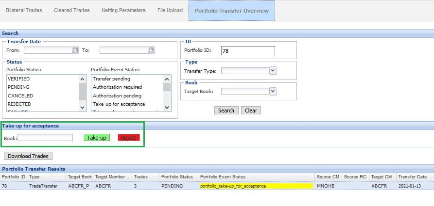 In case of a transfer to another Clearing Member (ID) (selection in prior step: trade transfer) the new Clearing Member (ID) will additionally need to perform the take-up of the portfolio: