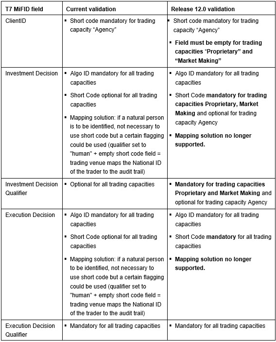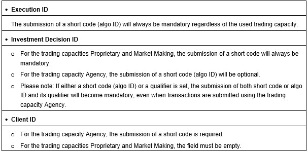For the identification of a natural person, the usage of a short code will be mandatory in the Execution Decision ID and in the Investment Decision ID. The mapping solution, which was supported before T7 Release 12.0, will not be offered any longer. The mapping solution enabled Trading Participants to submit an empty Execution Decision ID or Investment Decision ID and to set the respective qualifier to “human”, which led to the mapping of the submitting trader’s national ID into the trading venue’s audit trail by Deutsche Börse. However, the regulatory requirements are unchanged.