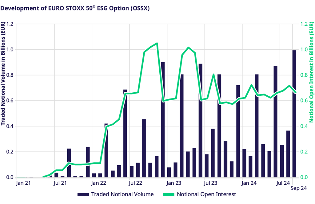 The Eurex ESG Index Derivatives segment continued its strong development in Q3 2024, already reaching the Notional Volume figures of the FY 2023 in September 2024.