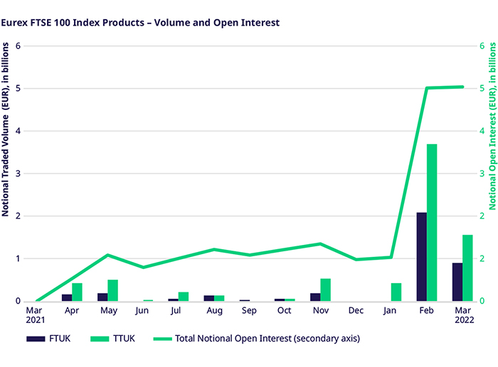 Since the launch in March 2021, the traded value was EUR 7.4 billion for FTSE 100 Index Total Return Futures (TTUK) and EUR 3.6 billion for the regular FTSE 100 Index Futures (FTUK). The combined open interest is at present approx. EUR 5 billion notional.