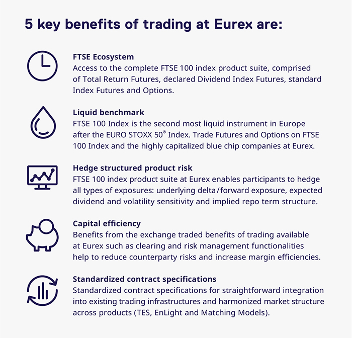 Another key benefit is the ability to achieve margin reductions at portfolio level between FTSE 100 exposure and other index and equity derivatives traded at Eurex.