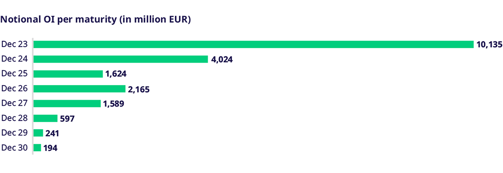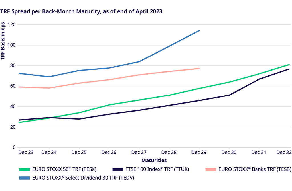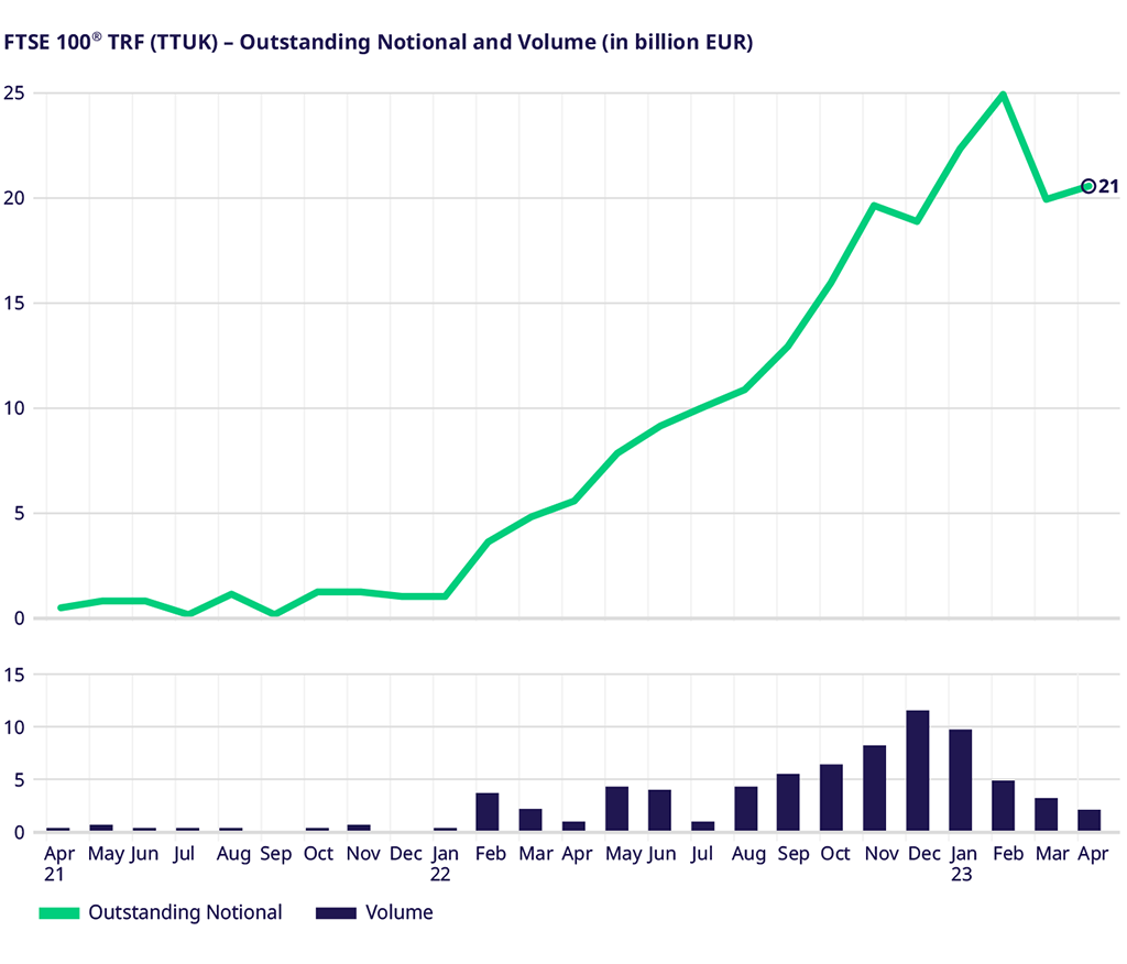 在忙碌的 3 月轉倉高峰期之後,4 月指數總回報期貨的交易量相應減少。不過,藍籌指數產品歐盟藍籌50指數(EURO STOXX 50®) 和富時100 指數 (FTSE 100) 的未平倉合約緩慢上升,分別達到1,120億歐元和200億英鎊。在歐盟高息30指數 (EURO STOXX Select Dividend 30) 中,指數總回報期貨的未平倉合約現已超過常規的價格回報指數期貨,為 16 億歐元。