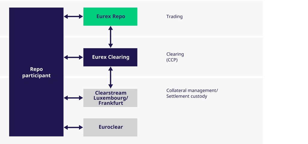 The Special and GC Repo segment ensures straight-through processing with automated connectivity to Eurex Clearing AG as central counterparty and the settlement organizations Clearstream Banking and Euroclear.