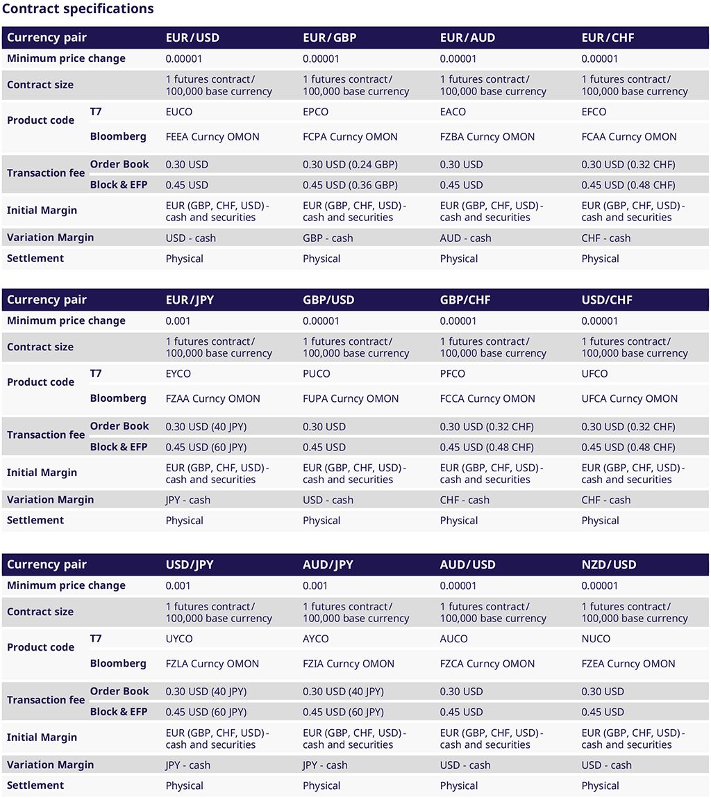 Currency pair | Min price change | Contract size | T7 | Bloomberg | Reuters | Order book | Block & EFP | |||