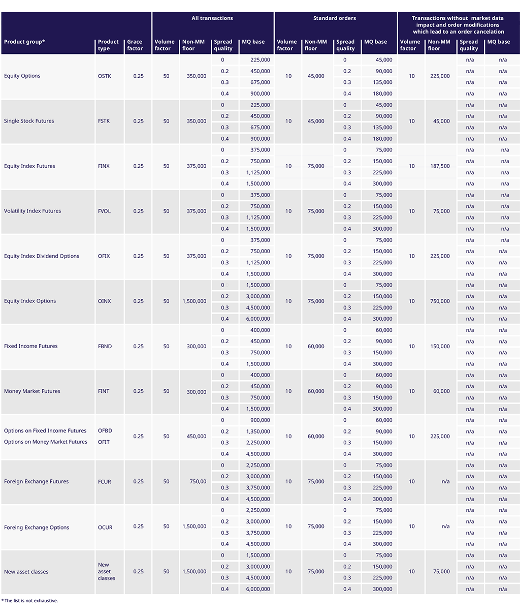 The transaction limit is calculated per Participant, per product, per trading day and per limit type. There are three types of transaction limits: a transaction limit for the order type "standard orders", a transaction limit for "all transactions", and a transaction limit for "transactions which do not lead to an market data update and order modifications which lead to an order cancelation without a trade". Every day, for each Participant, the actual transactions are counted per product. If this transaction count exceeds the transaction limit, then such instance is considered to be a violation of the limit.