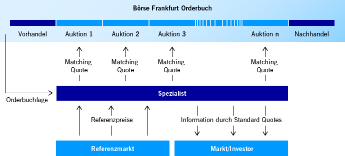 Eine ausführbare Orderbuchsituation liegt vor, wenn (1) eine Order gegen eine andere Order oder (2) gegen den Standard Quote des Spezialisten ausführbar ist oder (3) das Stop Limit einer Stop Order durch den Standard Quote erreicht wurde. Durch den Matching Quote gibt der Spezialist die Spanne vor, innerhalb derer das Handelssystem den Preis nach dem Meistausführungsprinzip berechnet. Damit stellt der Spezialist sicher, dass Orders nur zu marktgerechten Preisen ausgeführt werden. - Bereitstellung von zusätzlicher Liquidität zur Überbrückung von fehlendem Angebot bzw. fehlender Nachfrage zur Ausführung einer Order.