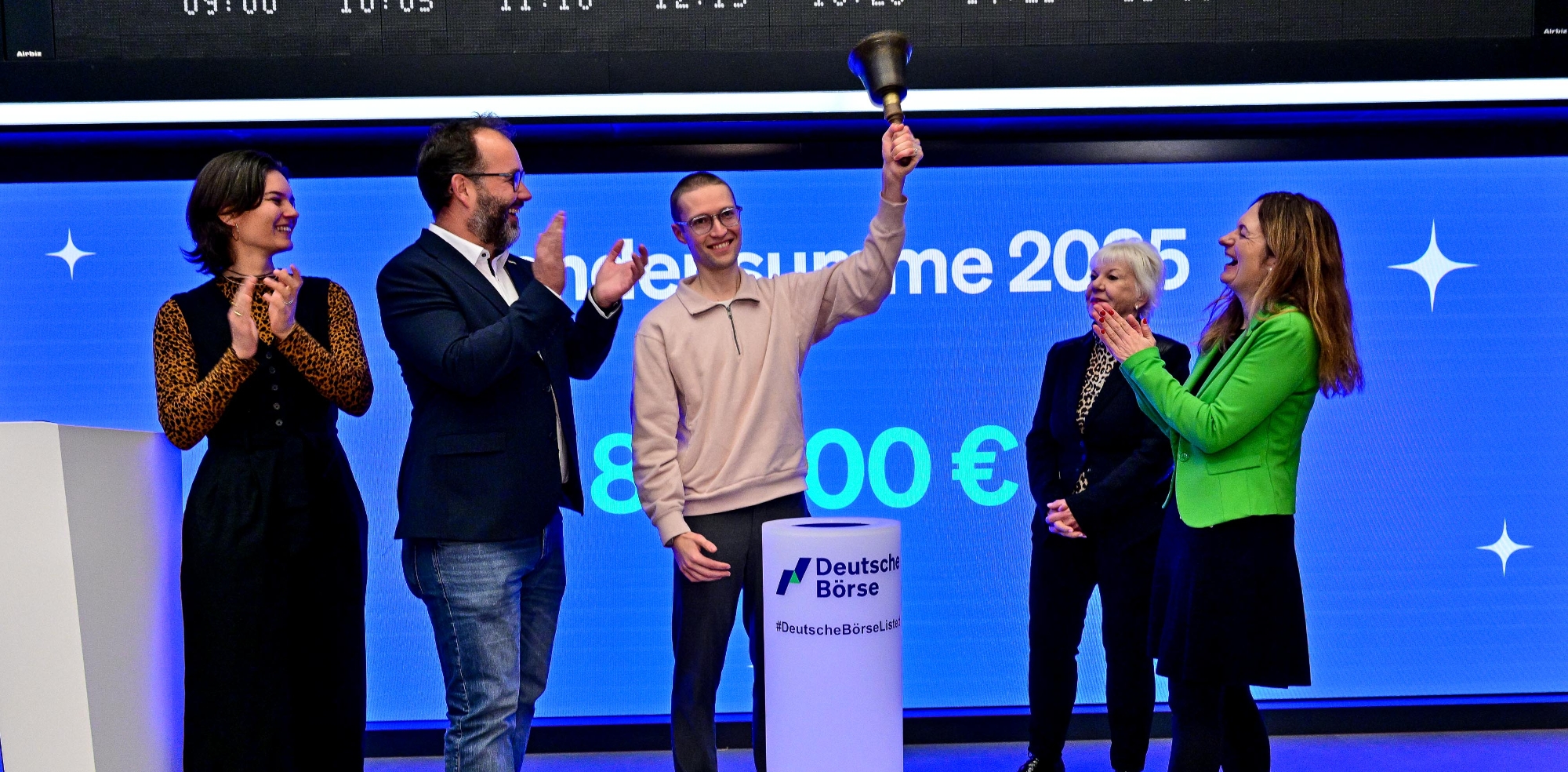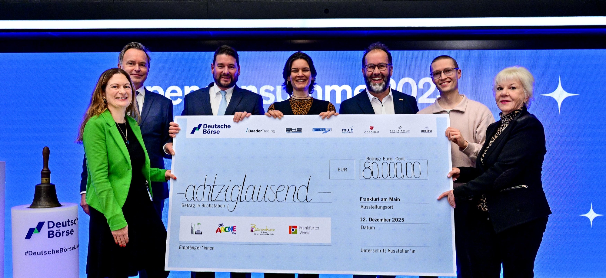 Mit der Aktion „Trading Charity – Handeln und Helfen“ haben die Deutsche Börse und die sieben Wertpapierhandelsbanken (Spezialisten) auf dem Frankfurter Börsenparkett eine Spendensumme von 80.000 € erzielt. Die Spendensumme stammt aus den Transaktions- und Handelsentgelten vom 5. Dezember. Anleger*innen, die vergangenen Freitag Aktien, Anleihen, Fonds, ETFs, ETCs oder ETNs über den Handelsplatz Deutsche Börse Frankfurt gehandelt haben, haben allen Einrichtungen gleichermaßen geholfen. Unterstützt werden in diesem Jahr vier gemeinnützige Einrichtungen: Die Arche, Ambulanter Kinder- und Jugendhospizdienst Frankfurt/Rhein-Main (DKHV e.V.), Kinderhospiz Bärenherz Wiesbaden und Frankfurter Kältebus e.V.. Der Spendenscheck wurde heute im Rahmen eines Bell Ringings in der Deutschen Börse Frankfurt übergeben.