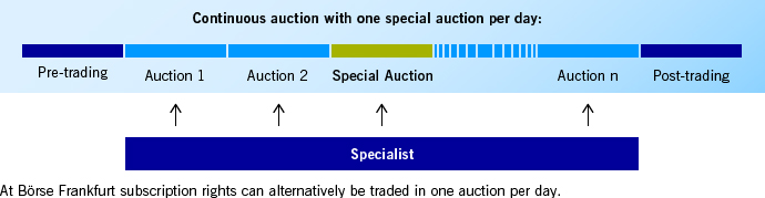 For subscription rights traded in continuous auctions with one special auction a day, the first price determination takes place on the first day of trading in the subscription right by means of a special auction. A special auction does not take place at a fixed point in time, but is conducted by the Specialist within a timeframe defined by the exchange during the main trading phase. The price determined in a special auction is identified as such.